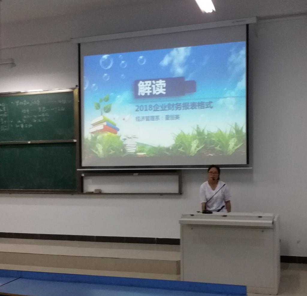 7月2日晚,在1号教学楼115教室,会计专业教研室主任董恒英老师,作了题为:解读“2018企业财务报表格式修订”的专题讲座。通过近两个小时的讲座,董恒英老师把企业执行新金融准则和新收入准则的的步骤、资产负债表项目的变化、资产负债表修订新增项目说明、利润表项目的变化、利润表修订新增项目说明等内容作了详细介绍,为提高学生的专业学习能力和综合素质提供了一定的帮助。