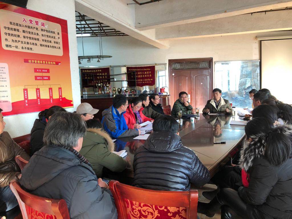 元月8日下午,学院办公室主任李庆华、保卫处处长王德恩等一行5人到我系检查指导党风廉政和党建工作。系副书记凌总成主持会议,向检查组做了个人2017年度抓基层党建工作述职报告,介绍了经济管理系直属党支部学习贯彻党的十九大精神,党风廉政建设与党建工作开展、综合治理和学生工作管理等情况。系全体党员和群众代表参加会议。