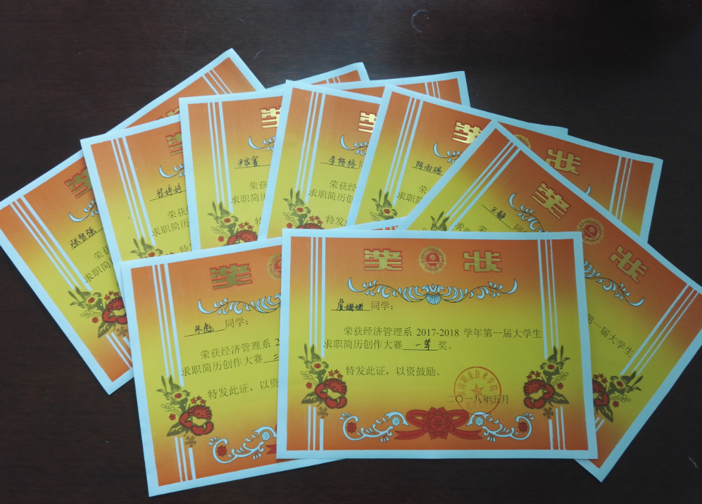 经过班级初选,系部决赛,共有8个作品脱颖而出。获奖作品均能较为得体地介绍个人能力,特长和爱好。简历的内容紧紧围绕求职意向而不太过空泛;教育背景注明详细,简历的细节,如排版,字体颜色等均经过精心设计。最终16会计1班的虞姗姗同学的作品得到评委的一致好评,获得了本次大赛的一等奖。