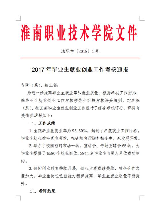 12月中旬,学校考核小组对我系2017年毕业生就业创业工作进行了考核,本次考核主要按组织领导、工作条件和工作内容三个方面,实行量化评分,最终我系综合评比位列全校之首。